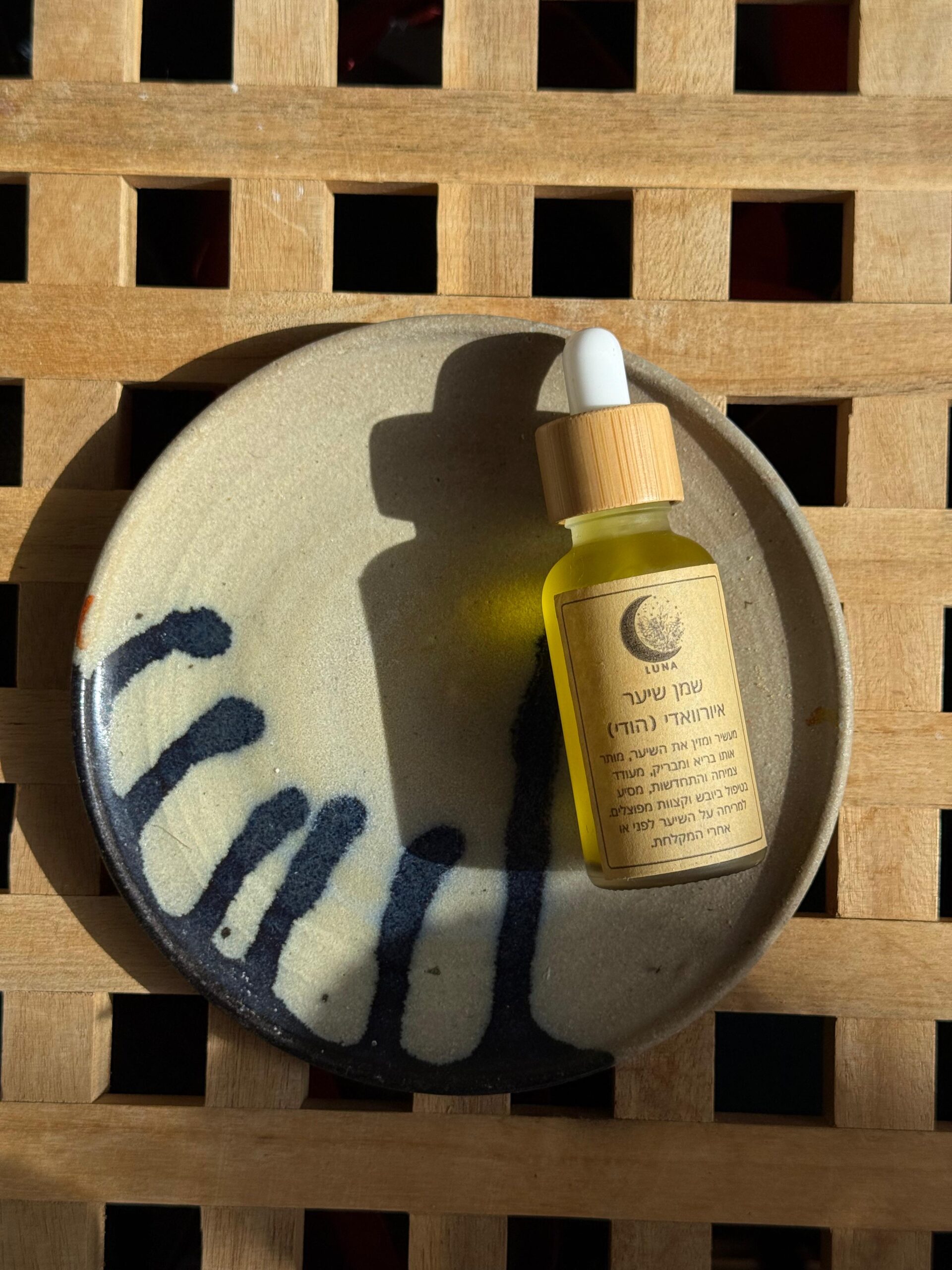 השמן עשוי משמן קיק וחוחובה שהושרו ב5 צמחי מרפא אירוואדים המיועדים לטיפול בשיער-
